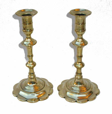 Made in Birmingham around 1730-50. Interior push-ups still work. Lovely petal base with conforming bobeche.
