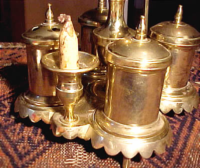 Made in Spain for export in the 18th century, this is a complete (except for the missing bell) Standish. Pots include three inkpots and a sander, as well as a candleholder. Note the scalloped apron and the shaped feet.